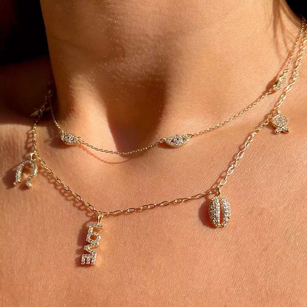 Colar Pingentes Zircônia Branca Banho de Ouro 18K Eleve seu estilo com este colar delicado e cheio de significado, elaborado com corrente de pequenos elos ovais banhada em ouro 18K. Seus pingentes encantadores — estrela do mar lisa, ferradura, búzio, palavra love e peixe — são todos cravejados com zircônias brancas que brilham com sofisticação e charme.